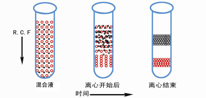 當不同顆粒存在浮力密度差時,在離心力場下,顆粒或向下沉降,或向上浮起,一直沿梯度移動到它們密度恰好相等的位置上(即等密度點)形成區帶,稱為等密度區帶離心法。等密度區帶離心的有效分離取決于顆粒的浮力密度差,密度差越大,分離效果越好,與顆粒的大小和形狀無關,但后兩者決定著達到平衡的速率、時間和區帶的寬度。