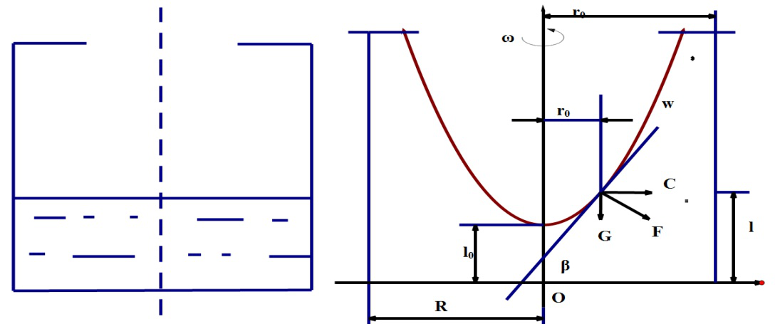 離心機開動后,因轉鼓的帶動,使轉鼓內液體在受重力作用的同時,還受到離心力的作用,形成一個旋轉的自由表面(如圖)