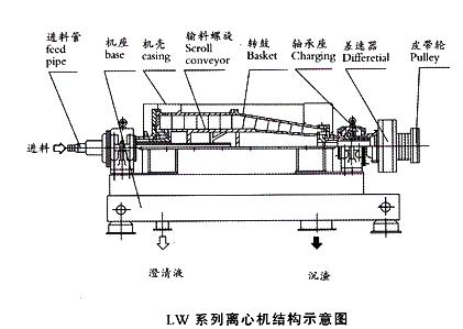 螺旋卸料式離心機,轉鼓圓錐形或柱—錐形,螺旋卸料器;進料管為螺旋輸送器的空心軸,在此空心軸上某一軸向位置(偏向底流口)開有進料口;溢流口(若干個溢流孔)在轉鼓的大端,底流口(排渣孔)在轉鼓的小端。