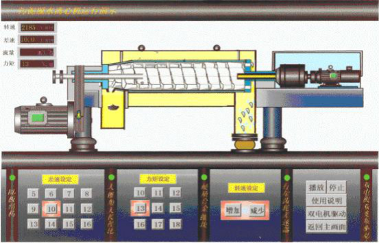 5.電控系統(PLC+液晶屏全自動控制,動態畫面顯示):由臥螺主機、進料泵、加藥泵、稀釋水泵、PLC控制及相關電氣元件控制箱及液晶觸摸屏組成。