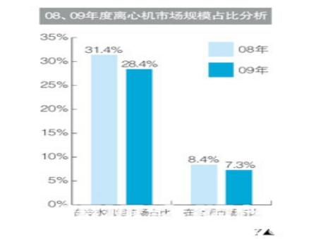 然而在2009年度中,離心機市場整體規模卻一改近幾年穩步增長的態勢,陡然出現了下滑。據統計,2009年度離心機市場自身規模同比2008年度下滑幅度超過10%,在冷水機組市場占比中同比下滑3%,在全G市場占比中同比下滑超過1%(圖7)。可以說,離心機市場**為直接的反應出金融風暴帶給09年度行業的沖擊。尤其是在08年度中,大型、特大型建設項目投資減少的情況延續到09年度中,加上離心機與其他產品相比相對較窄的適用性,也因此在2009年度中受到了較大的影響。