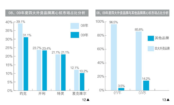 可以看到,在中小型機組市場競爭力下滑的外資品牌繼續更多的精力投入在離心機市場,意圖將后來者可能未來的市場沖擊弱化到**小;其他一些離心機市場份額不大的外資、G產品牌更是將離心機作為市場的重中之重,尋求更為快速的專業化的運作方式以追求規模上的迅速提升;而那些沒有離心機產品的品牌也紛紛加快了步伐,尋求各種方式將自由品牌的離心機產品推向市場。
