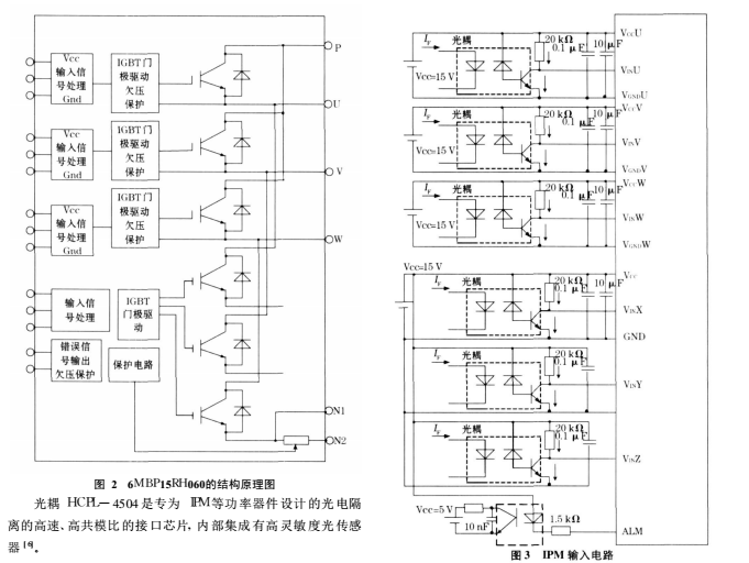 | 片, 帶有過流保護和欠壓保護的功能, 外部與 PWM信號相連, | 取 600 V, 導通電流取 15 A, IPM采用 6MBP15RH060。 該芯片 | ||