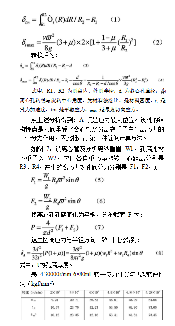 離心機(jī),轉(zhuǎn)子在使用中飛裂發(fā)生了數(shù)次。 某醫(yī)學(xué)院進(jìn)口日立超速機(jī),一只 50000r/min 角轉(zhuǎn)子中斷幾 年沒使用,后來重新使用時(shí),轉(zhuǎn)速升** 40000r/min 轉(zhuǎn)子即飛 裂,造成重大損失。因此轉(zhuǎn)子強(qiáng)度及安全一直是G內(nèi)外生 產(chǎn)廠商和用戶**關(guān)心的問題。那么影響轉(zhuǎn)子強(qiáng)度的原因是 什么呢?本文試圖通過對(duì)解轉(zhuǎn)子的應(yīng)力分析、強(qiáng)度計(jì)算、安 全系數(shù)的選擇以及飛裂殘骸分析來論述轉(zhuǎn)子裂紋產(chǎn)生原 因,提出預(yù)防措施。 1 角轉(zhuǎn)子應(yīng)力分析 如圖 1 所示,角轉(zhuǎn)子具有 2n 個(gè)直徑為 d 的對(duì)稱分布 離心孔,中心具有導(dǎo)向通孔 d1 和定位錐孔 。當(dāng)轉(zhuǎn)子繞定 軸旋轉(zhuǎn)時(shí),任一質(zhì)點(diǎn)產(chǎn)生的離心力為 Fi=miRiw2(mi 為任一 質(zhì)點(diǎn),Ri 為質(zhì)點(diǎn)質(zhì)點(diǎn)回轉(zhuǎn)半徑,w 為質(zhì)點(diǎn)角速度)。由于轉(zhuǎn) 子形狀復(fù)雜,各質(zhì)點(diǎn)體積力不同,產(chǎn)生了附加彎矩。為了弄 清轉(zhuǎn)子受力狀態(tài),找出危險(xiǎn)截面,對(duì)轉(zhuǎn)子進(jìn)行了光彈實(shí)驗(yàn)。 通過對(duì)環(huán)氧樹脂轉(zhuǎn)子動(dòng)態(tài)應(yīng)力凍結(jié)、切片及應(yīng)力條紋測(cè)量, 得到了圖 2、3、4 轉(zhuǎn)子應(yīng)力分布圖。通過實(shí)驗(yàn)發(fā)現(xiàn)轉(zhuǎn)子處于 三向不等應(yīng)力的拉伸和壓縮,而且切向應(yīng)力 t 總是大于徑 向應(yīng)力 r 和軸向應(yīng)力 z 應(yīng)力**大區(qū)域在通過 A 點(diǎn)的圓周 上(見圖 2)。A 點(diǎn)的高度在 錐孔小端附近,與轉(zhuǎn)子**大外 徑高度基本一致。通過測(cè)量得到 A 點(diǎn)處于兩離心孔之間 (無孔)的應(yīng)力大于處于離心孔(有孔)中的應(yīng)力。測(cè)量結(jié)果 見表 1。
