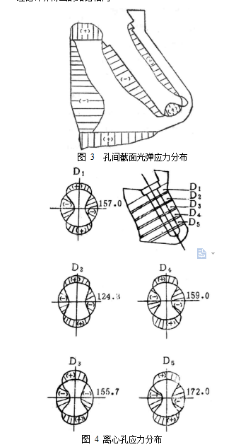 圖 4 表示垂直于離心孔軸線不同截面應(yīng)力分布。從測(cè)量得到,離心孔沿轉(zhuǎn)子直徑方向受拉力,沿轉(zhuǎn)子圓周方向受壓力,而且位于轉(zhuǎn)子下端的應(yīng)力比上端大。