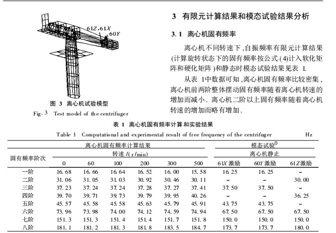 心機臂上裝有振動臺 ,在振動臺整個工作范圍內 ,可能與機臂發生共振 ,因此有必要全面了解離心機的振動特性.但由于技術的原因 ,離心機在回轉狀態下難以進行模態試驗 ,本文只對離心機靜止固有頻率和振型進行了測試 ,而通過有限元方法彌補模態試驗的不足 ,得到離心機的固有特性隨轉速變化的特性 ,為隔振系統的設計提供重要的依據.