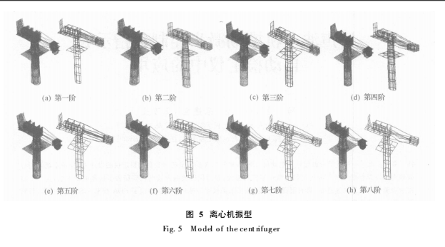 ( 3)第五階振型與動平衡裝置的振動有關 ,如圖 5( e)所示. 動平衡裝置既能整體地前后移動 ,以調節前后力矩平衡 ,又能通過電機拖動質量塊沿動平衡裝置的滑軌上下移動 ,以調節離心機臂上下質量和力矩的平衡 ,但由于動平衡裝置及支承臺板的剛度較差 ,給離心機帶來了附加的振動. 因此 ,為了提高動平衡裝置固有頻率 ,應采用剛度較好的平衡倉式裝置 ,且支承臺板應采用加強筋 ,提高其抗彎剛度.